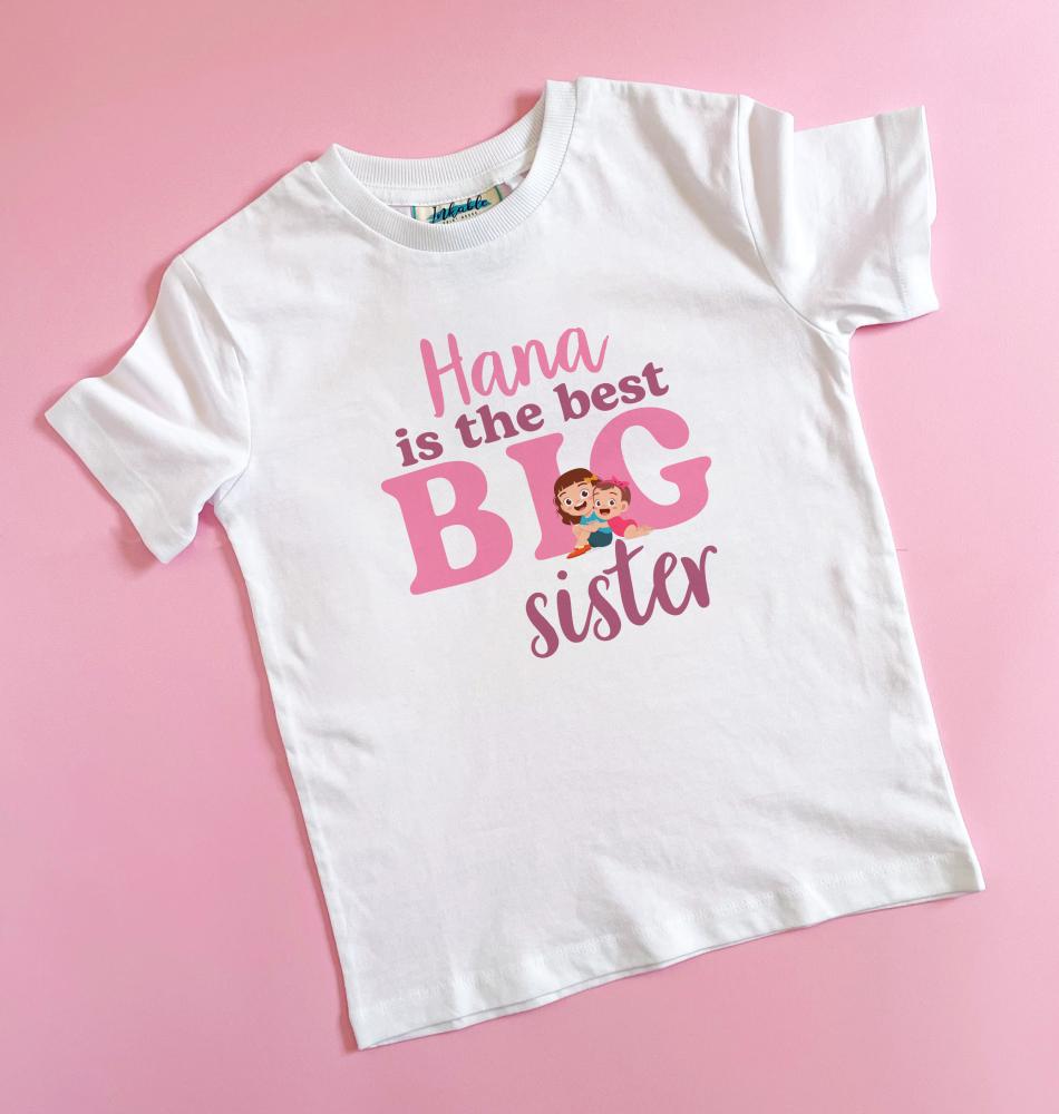 تصميم تيشرتات بنات طباعه للاطفال تيشيرت الاخت الاكبر، باللغة الانجليزيه، تيشيرت طباعه للتصوير في حفل استقبال المولود. تيشرت الاخت الكبيره مزينه ب رسومات النجوم و طباعة عباره: (Name) is the best Big Sister. مع امكاننا طباعه الاسم على الملابس.